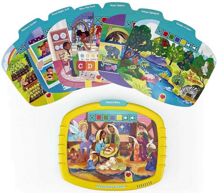 Interactive Bible activity pad reads, sings, and asks questions! 16 busy scenes feature modes for matching, looking and finding, thinking, and guessing. Also hear favorite Bible story moments and sing along with best-loved Bible songs. Card themes are God Made the World, Garden of Eden, Noah’s Ark, Daniel in the Lion’s Den, Jonah, First Christmas, Sunday School, Children’s Choir, and others. More than 200 activities for hours of learning fun for boys and girls! The card reader reinforces early learning essentials in a fun and interactive way to engage and motivate young learners. Cards store in the back of the tablet making them easy to track and to take on-the-go. No computer or internet hook-up is necessary! A great introduction to early learning tablets! Perfect Easter gift, great for Christian family time all year long!