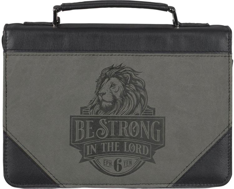 The Be Strong in the LORD Black and Gray Lion Faux Leather Classic Bible Cover is part of the Strong in the LORD Black and Gray Lion Collection. This collection includes a stainless steel tumbler with a reusable straw, a metal keychain, a ceramic mug, a stainless steel travel tumbler, a faux leather Bible cover, a reusable non-woven shopping tote bag, and a faux leather journal.
