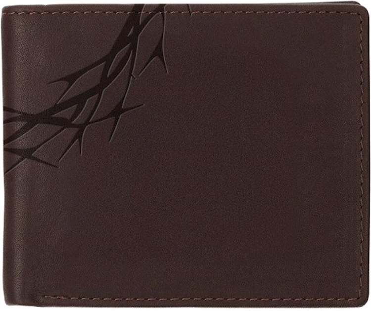 The men’s wallet is made from full grain espresso-brown leather and is heat-debossed with a crown of thorns that expands over the front, spine, and back.