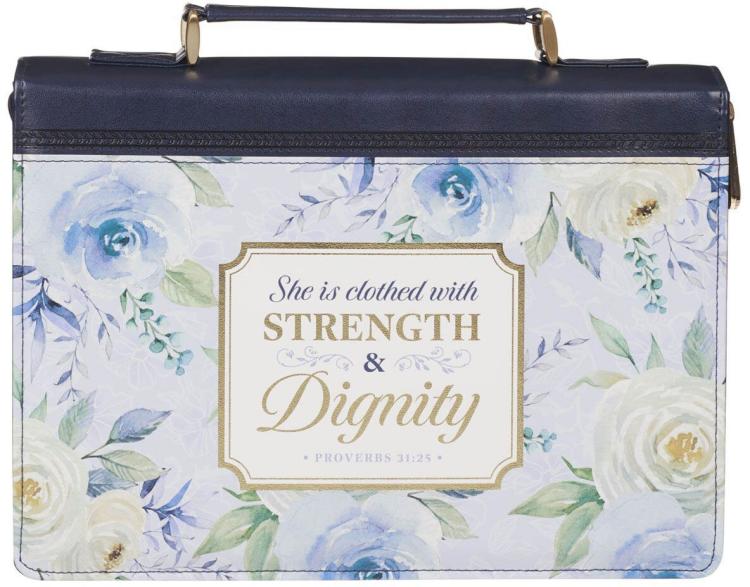 The Strength and Dignity Indigo Rose Faux Leather Fashion Bible Cover is ideal for a woman of God who embodies strength and gentleness, wisdom and kindness to safeguard her Bible.