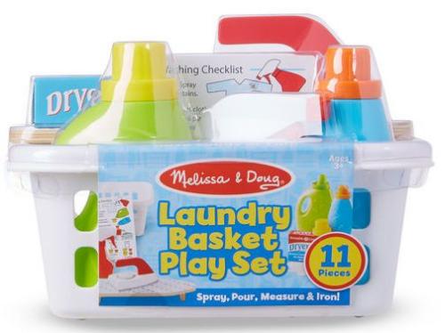 Kids will have loads of fun playing house with this these realistic laundry accessories! The 14-piece set includes a sturdy take-along basket to hold all the supplies and a reusable activity card to check off chores. Kids three and older will love spraying, measuring, and pressing with a stain remover spray bottle that can be filled with water, detergent and fabric softener bottles with removable lids, a box of three pretend dryer sheets, and a wooden iron and ironing board. Laundry day has never been such fun!