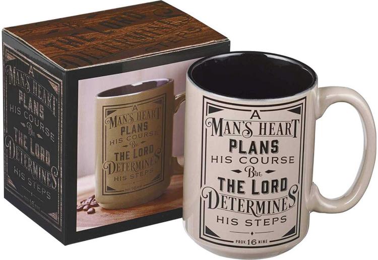 Start your day with a hot beverage served in the A Mans s Heart Ceramic Coffee Mug. A patch with the sentiment taken from Proverbs 16:9 is etched into the tan coffee mug in dark coffee brown, and reads, A Mans Heart plans his course, but the Lord determines his steps. The inside of the tan ceramic mug is colored in a coordinated a dark coffee brown.