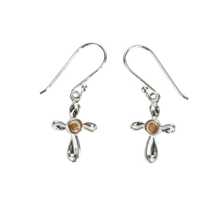 Elegant and inspiring, these silver plated earrings feature petal cross dangles with clear centers that hold a real mustard seed. Petal shapes are turned slightly sideways and are scooped spoon style for a dimensional look. Cross is 5/8″”””L x 7/16″”W. Earring wires are sterling silver. The pair comes on a decorative folded tag with Matt. 17:20 verse inside. Text of verse inside card: “”…Truly I tell you, if you have faith as small as a mustard seed, you can say to this mountain, ‘Move from here to there, ‘ and it will move. Nothing will be impossible for you.”” Matt 17:20