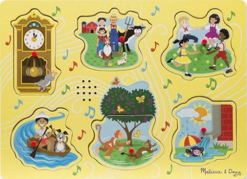 Sing along with favorite childhood characters like The Itsy Bitsy Spider and the Farmer in the Dell with this unique wooden peg song puzzle! Match the six illustrated wooden puzzle pieces to the pictures in the beautifully carved wooden puzzle board to hear six different nursery rhymes (Hickory Dickory Dock, The Farmer in the Dell, Ring Around the Rosie, Row, Row, Row Your Boat, Pop Goes the Weasel, and The Itsy Bitsy Spider). Plastic pegs make it easy for small hands to grasp and manipulate the pieces. Lyrics are included on the puzzle so kids can sing along as they complete the puzzle!