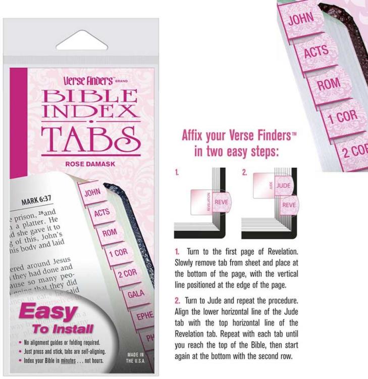 $5.99Features: Easy to install – no alignment guides or folding required. Just press and stick. Tabs are self-aligning. Index your Bible in minutes…not hours. Attractive and durable for years of trouble-free use. Horizontal style – reads left to right. Compact 3/8″ design indexes a standard Bible in only 2 rows, making books easier to find.