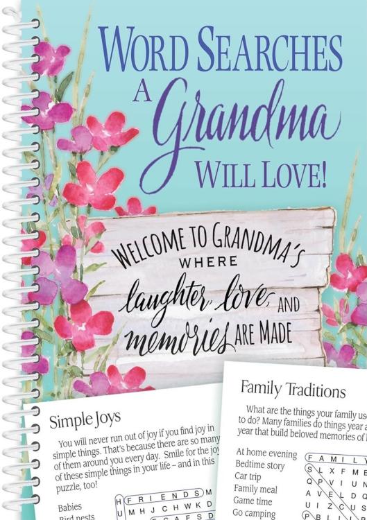 Grandma, Mammaw, Nana, Mimi, Granny… whatever the very special name she’s called, it’s the most beautiful name in the world. A grandmother does so much for her family, and for that, this book is made to give her a break for enjoyment. These word search puzzles are filled with special moments to remember, beautiful things from nature, childhood memories, and happenings through the decades.